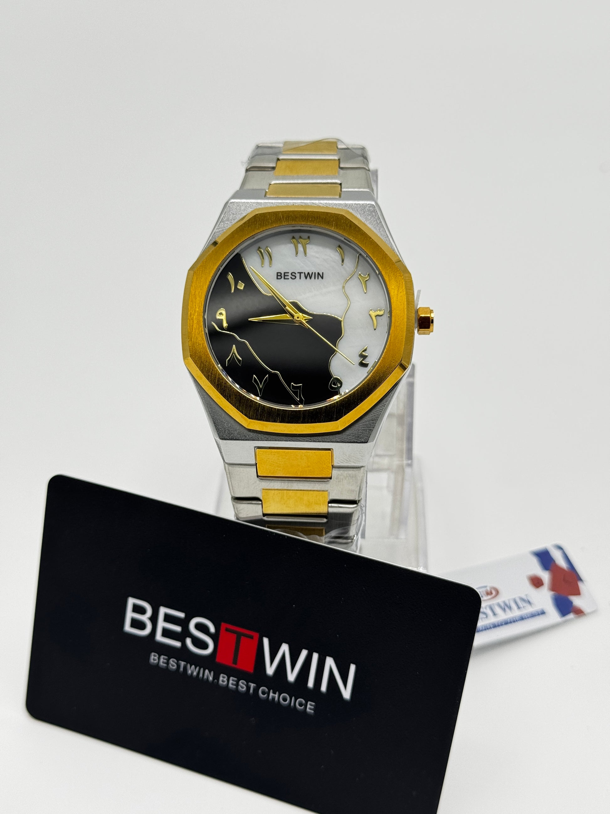 Elegant and unique, this Bestwin wristwatch features a black-and-white dual-tone dial accented with golden Arabic numeral markers. The bold gold bezel and two-tone stainless steel bracelet give it a premium look, perfect for daily wear or special occasions.