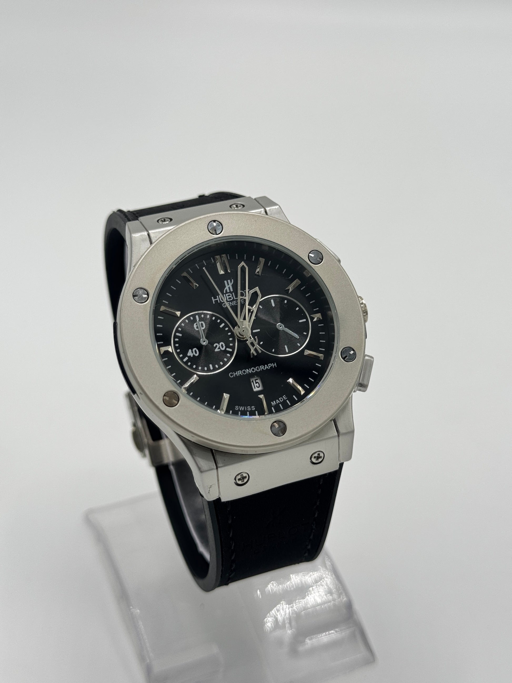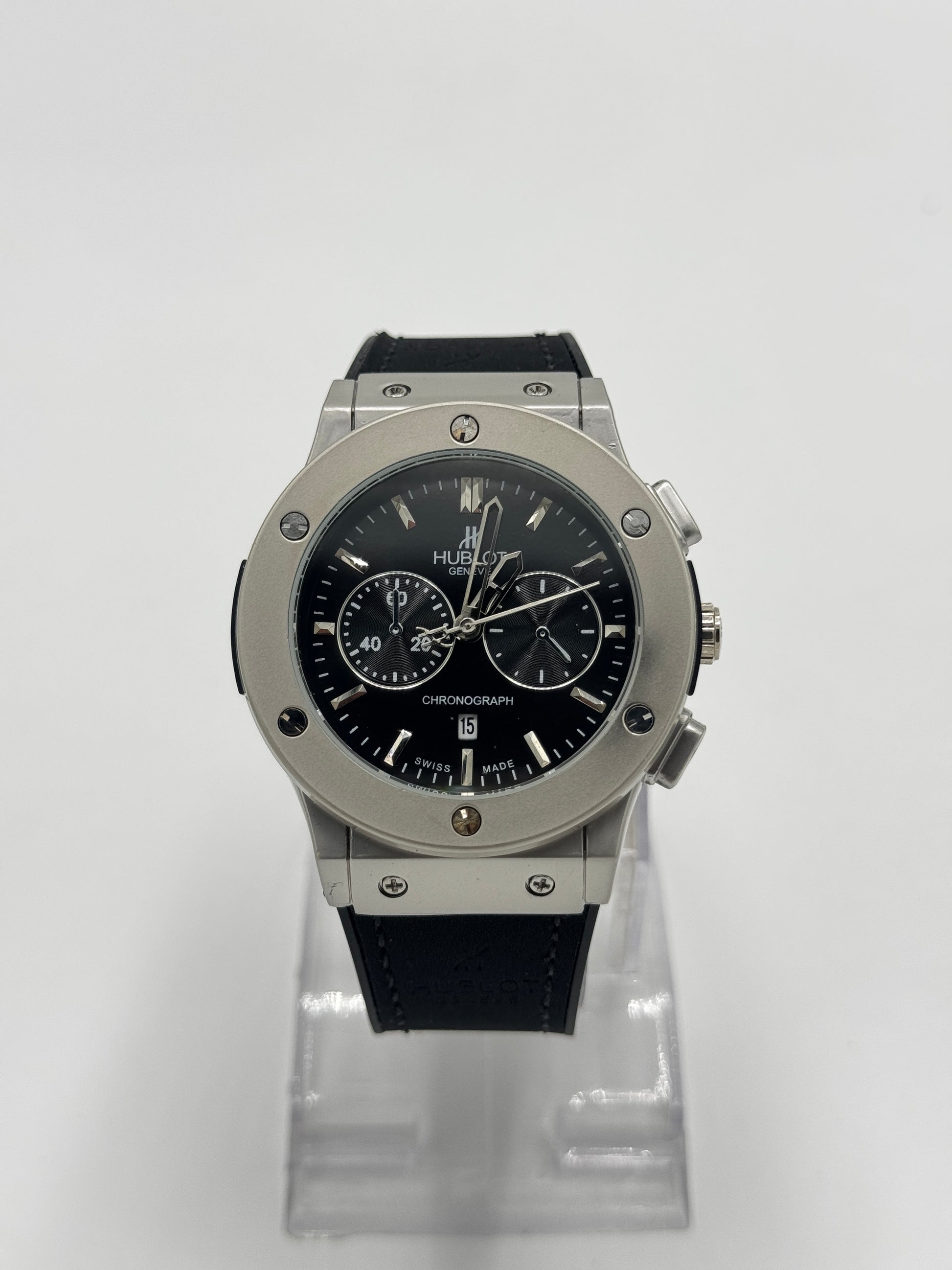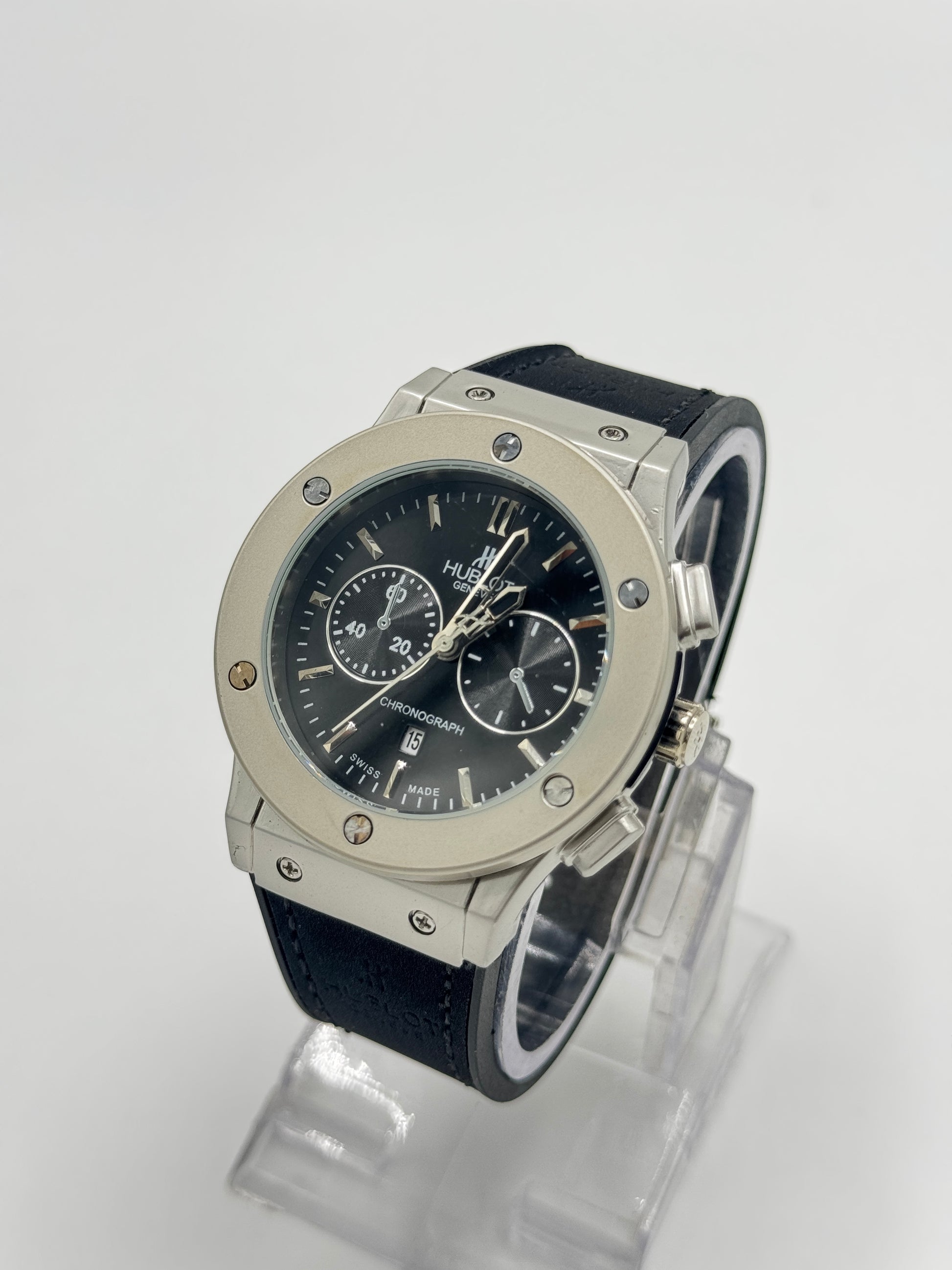 Timeless and versatile, this chronograph watch combines a bold silver bezel with a sleek black dial. Featuring detailed sub-dials and a functional date display, it delivers both style and practicality. The black leather strap completes the classic yet sporty look.