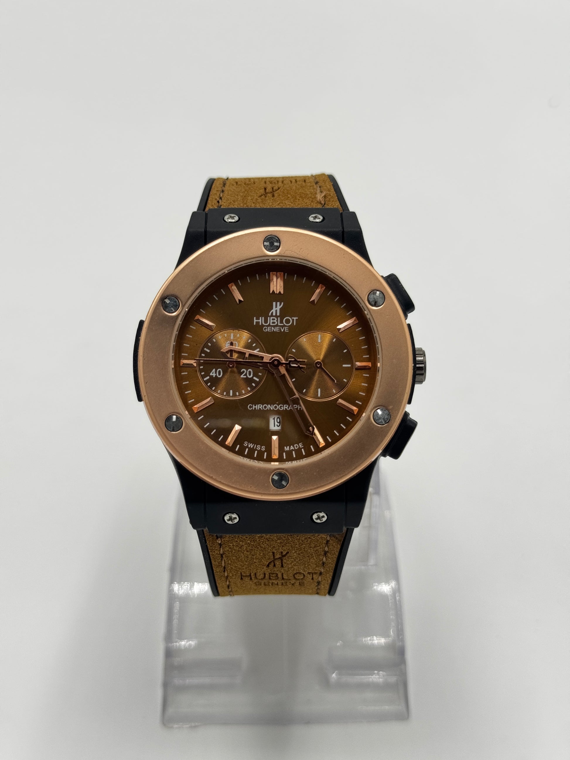 Sporty yet refined, this Hublot-inspired chronograph watch is designed for bold personalities. It features a striking copper-brown dial with three functional sub-dials, paired with a rose gold-tone bezel secured by iconic exposed screws. The black case contrasts stylishly with a premium leather strap, embossed with the Hublot logo. With its date display at 6 o’clock and chronograph detailing, it’s a perfect balance of luxury and performance.