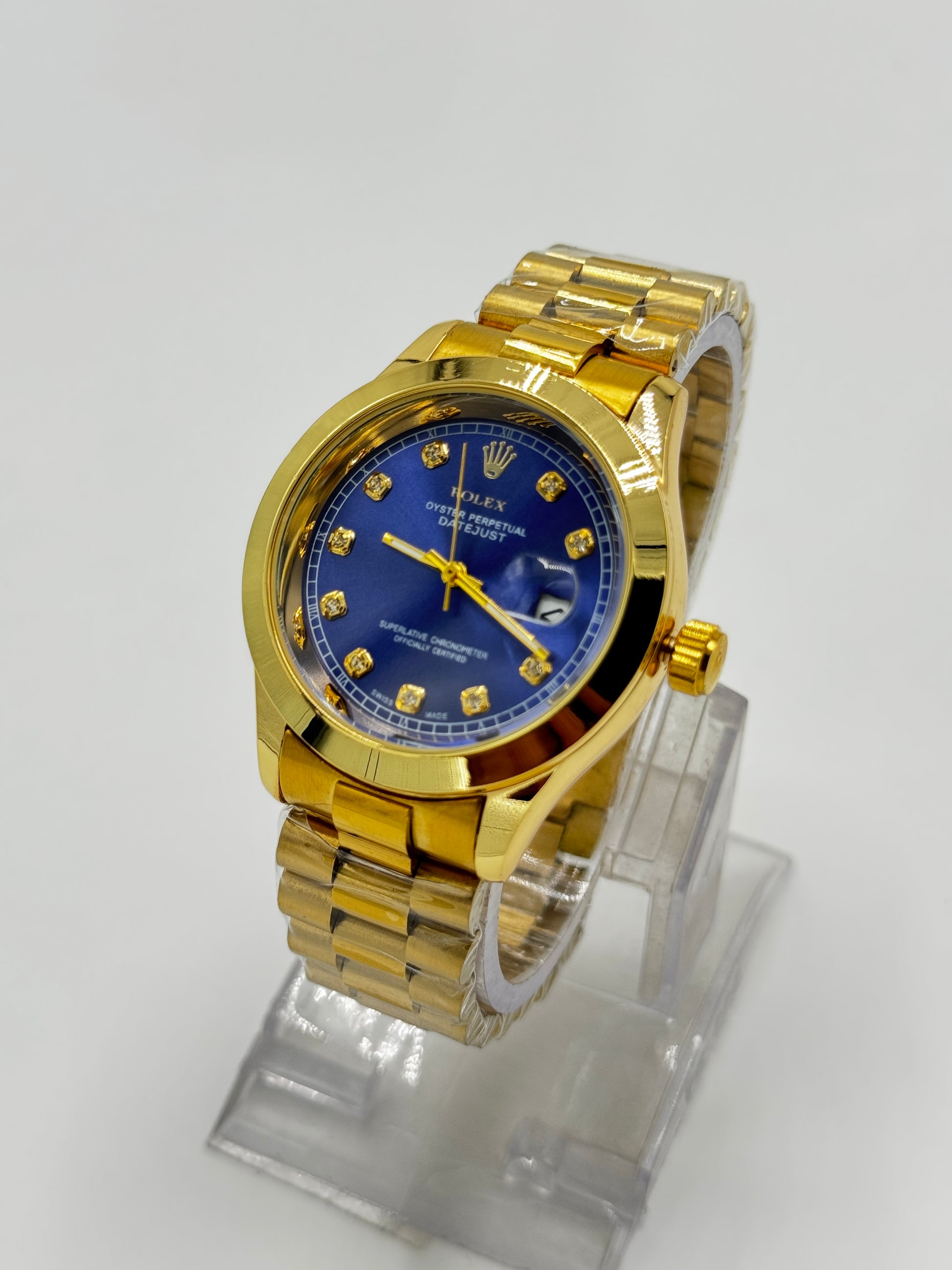 Royal blue dial with diamond-style hour markers