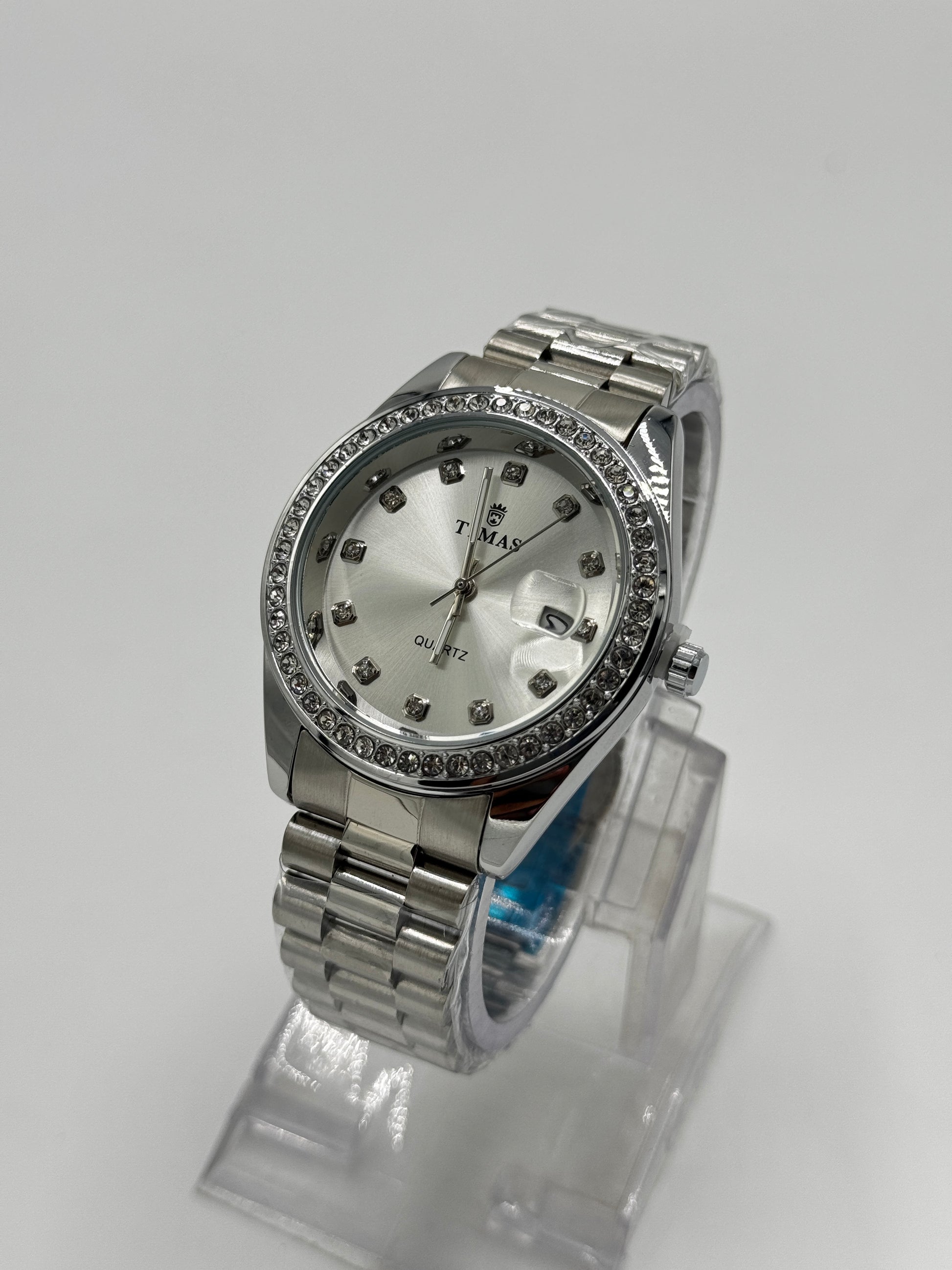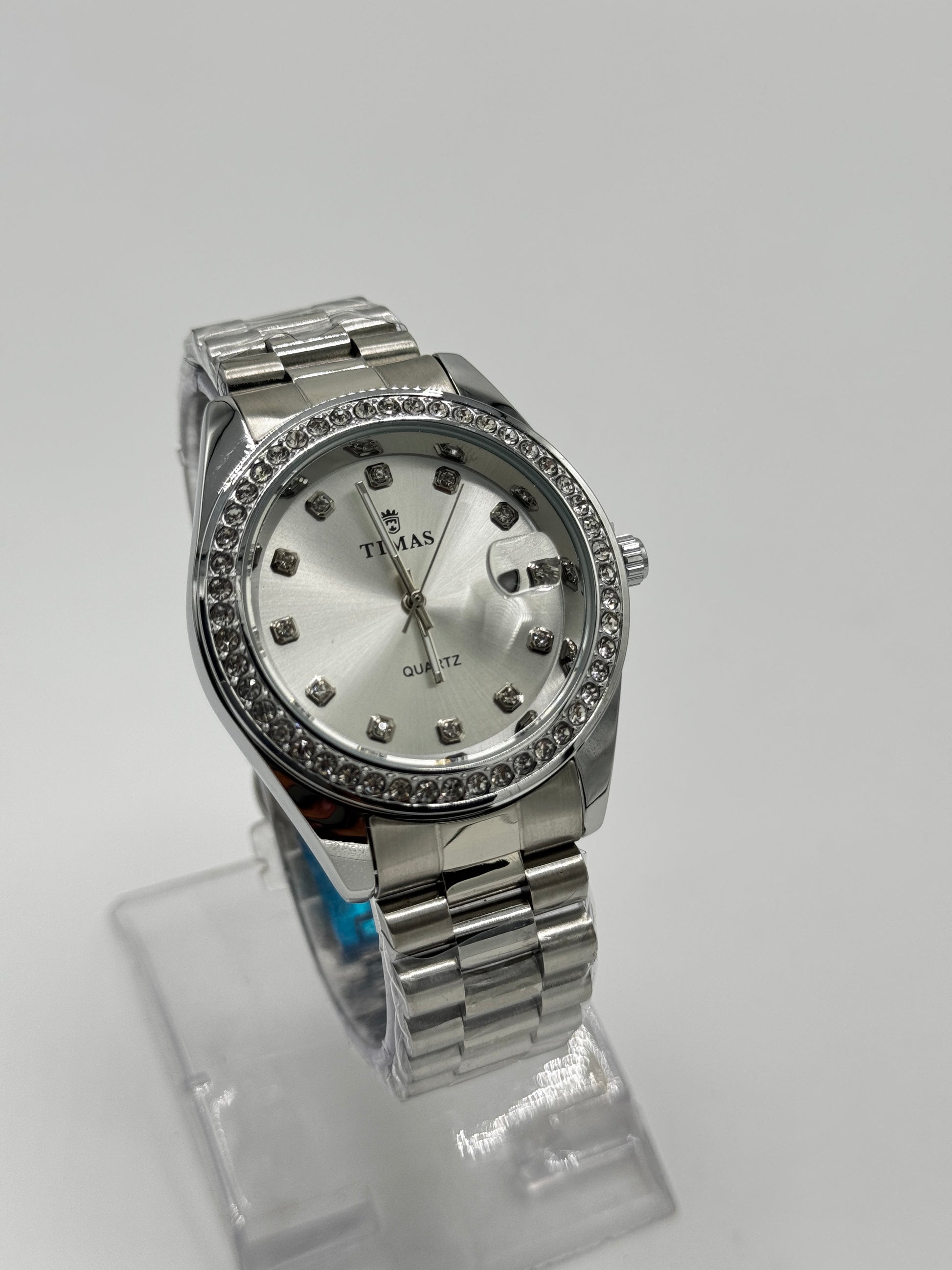 Elevate your style with the Timas Quartz wristwatch, a perfect blend of elegance and functionality. Featuring a polished silver-tone stainless steel strap and a crystal-studded bezel, this timepiece exudes sophistication. The sunburst silver dial is enhanced with sparkling stone hour markers and a date display at 3 o’clock, ensuring both class and convenience. Designed for those who appreciate refined luxury at an affordable price, the Timas Quartz watch is ideal for both formal and casual wear.